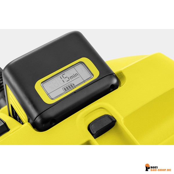 • 36 V Kärcher Battery Power-Wechselakku: Ermöglicht kabelloses Arbeiten mit maximaler Bewegungsfreiheit. Die Real Time Technology im LCD-Akkudisplay zeigt Restlaufzeit, Ladezeit und Kapazität an und ist kompatibel mit allen 36 V Kärcher Battery Power-Geräten.