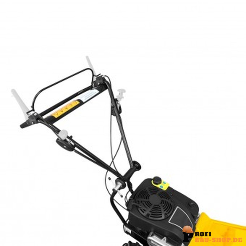 Für maximalen Bedienkomfort sorgt der ergonomische Lenkholm, der sich individuell in der Höhe verstellen lässt. Dies schont den Rücken des Anwenders auch bei längeren Einsätzen nachhaltig. Für den Transport im Auto oder zur platzsparenden Lagerung kann der Holm werkzeuglos und schnell eingeklappt werden. Die grobstollige Luftbereifung mit Ackerprofil garantiert dabei stets optimalen Grip und einfaches Handling, selbst in unwegsamem Gelände oder an Hanglagen mit einer Schräglage von bis zu 20°.