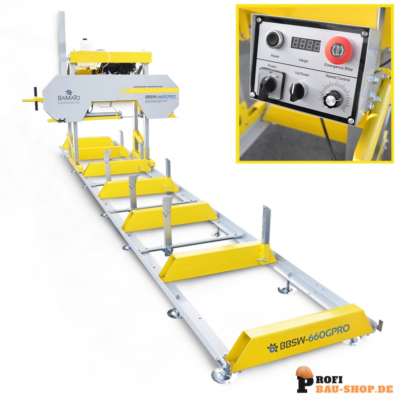 Die BAMATO BBSW-660GPRO ist die Profi-Lösung für präzises Sägen von Weich- und Hartholz. Mit kraftvollem 6,6 kW Benzinmotor, E-Start, elektrischer Höhenverstellung und digitaler Anzeige bietet sie maximalen Bedienkomfort und exakte Ergebnisse auf einer 5,9 m Rollbahn.