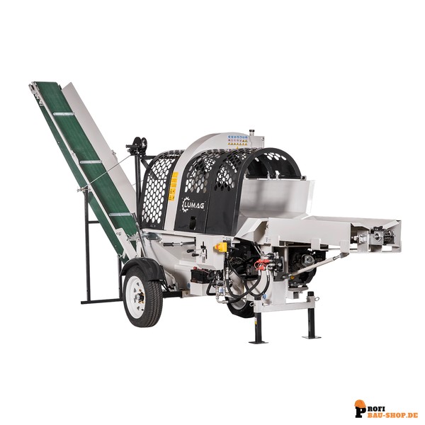 Der LUMAG Benzin-Sägespaltautomat SSA500GH-PRO/S hydraulisch ist eine leistungsstarke und zuverlässige Maschine, die speziell für die effiziente Brennholzaufbereitung konzipiert wurde. Dank seines robusten 9,2 kW Benzinmotors mit 420 cm³ Hubraum verarbeitet er mühelos größere Holzstämme mit einem Durchmesser von bis zu 50 cm. Die hochwertige OREGON-Sägekette, kombiniert mit automatischer Schmierung und hydraulischer Bedienung für Kettensäge und Stammhalter, garantiert nicht nur eine lange Lebensdauer, sondern auch ein schnelles und komfortables Arbeiten. Mit dem integrierten hydraulischen Zuförderband wird das Holz automatisch und kontinuierlich der Spalteinheit zugeführt, was einen Arbeitsfluss von beeindruckenden 5-8 m³ Holz pro Stunde ermöglicht. Der automatische Abtransport des gespaltenen Holzes mittels Gurtförderer rundet das Profil dieses in Deutschland entwickelten und konstruierten Profi-Sägespaltautomaten ab, der durch Komponenten wie PARKER Ventile und Pumpen höchste Zuverlässigkeit verspricht.