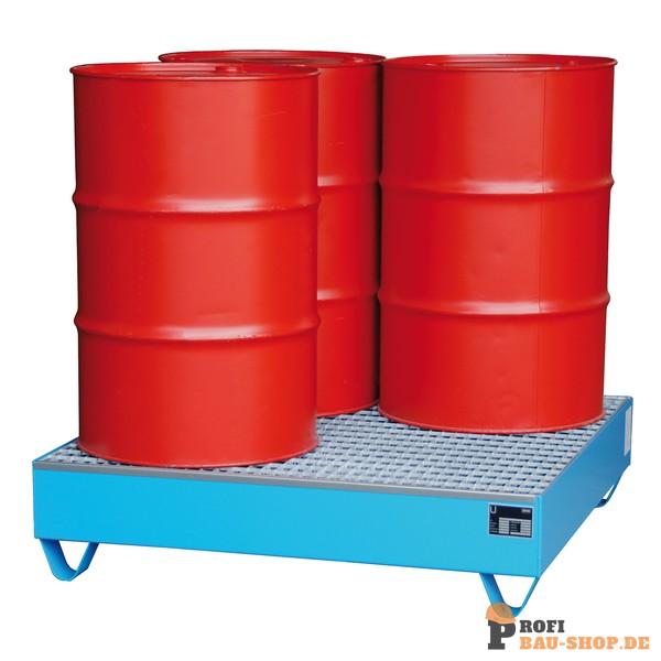 Die Bauer Südlohn Auffangwanne 2032 in Lichtblau bietet sichere Lagerung für bis zu vier 200-Liter-Fässer. Aus 3 mm Stahlblech mit verzinktem Gitterrost (1000 kg/m² Tragfähigkeit) gefertigt, ist sie gemäß StawaR für entzündbare und gewässergefährdende Flüssigkeiten zugelassen. Mit 100 mm Unterfahrhöhe.
