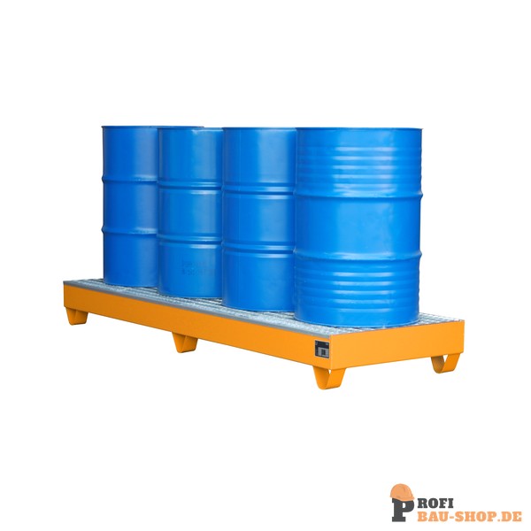 Robuste Bauer Südlohn Auffangwanne 2042, lackiert in Gelborange, für die sichere Lagerung von bis zu vier 200-Liter-Fässern. Flexibel auch für 60-Liter-Fässer und Kleingebinde. Zugelassen für entzündbare und gewässergefährdende Flüssigkeiten (GHS 1-4). Gefertigt aus 3 mm Stahlblech mit verzinktem Gitterrost.