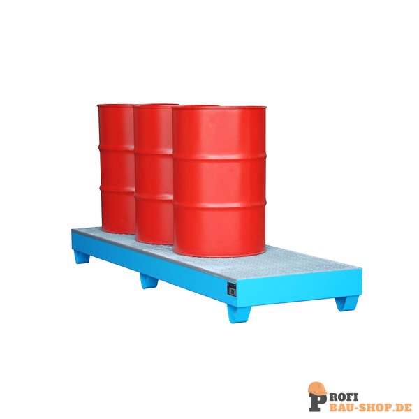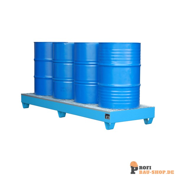 Die Bauer Südlohn Auffangwanne 2042 in Lichtblau (RAL 5012) bietet sichere und vorschriftsmäßige Lagerung für bis zu vier 200-l-Fässer. Aus robustem 3 mm Stahlblech gefertigt, mit verzinktem Gitterrost (1000 kg/m² Tragfähigkeit) und 100 mm Unterfahrhöhe. Zugelassen für entzündbare und gewässergefährdende Flüssigkeiten (GHS 1-4) gemäß StawaR. Ideal für den professionellen Einsatz.