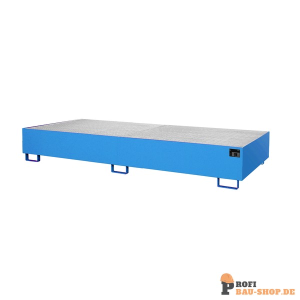 Die Bauer Südlohn Regalwanne RW-GR 3300-2 in Lichtblau (RAL 5012) rüstet Regalsysteme gesetzeskonform um. Mit 540 l Auffangvolumen, 3 mm Stahlblech und verzinktem Gitterrost (1000 kg/m²) ist sie ideal für 200-Liter-Gebinde entzündbarer und gewässergefährdender Flüssigkeiten. ÜHP gem. StawaR für maximale Sicherheit.