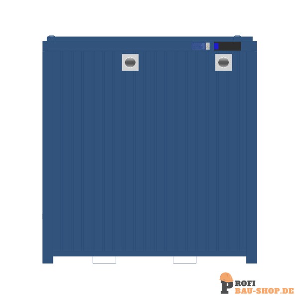 Robuster CONTAINEX Sanitärcontainer 08' aus der CLASSIC Line. Ausgestattet mit 2 Toiletten, 2 Waschbecken und Heizung in RAL 5010 Enzianblau.