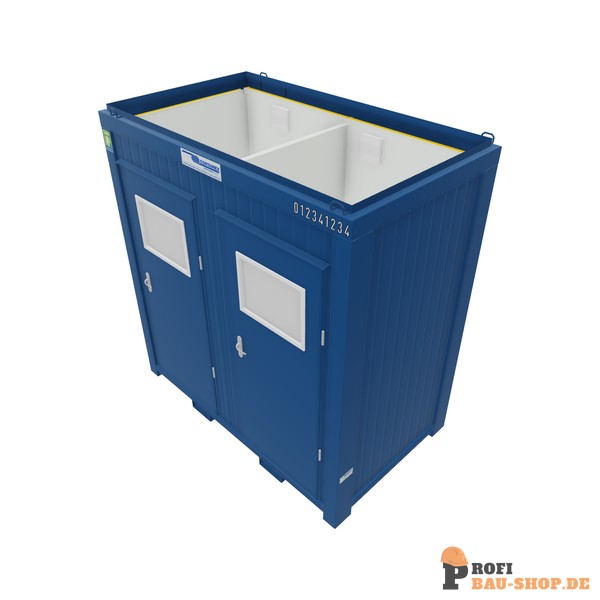 Der robuste CONTAINEX Sanitärcontainer 08' aus der CLASSIC Line bietet eine komplette Sanitärlösung mit 2 Toiletten, Urinal und 2 Waschbecken. Ideal für Baustellen und Events, in RAL 5010 Enzianblau.