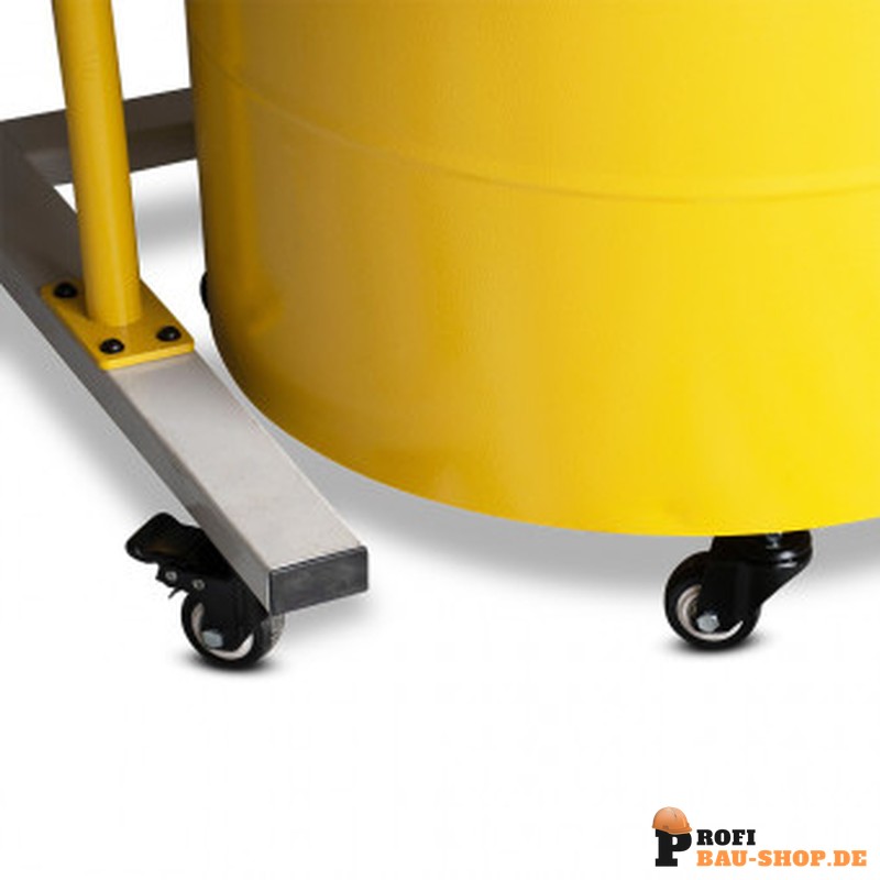 Großzügige Absaugtonne aus Stahlblech mit praktischer Füllstandsanzeige und eigenem Fahrwerk
