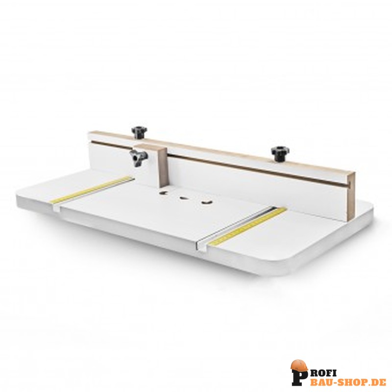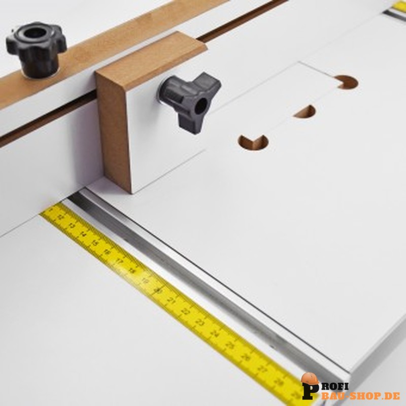 Für exakte Wiederholgenauigkeit sorgen die integrierten T-Nuten, in denen die mitgelieferten Anschläge oder optionale Winkel sicher fixiert werden können. Die Anschläge verfügen über einen praktischen Schnellverschluss, der eine werkzeuglose Justierung per Hand ermöglicht. Das beidseitig angebrachte cm-Maßband unterstützt Sie bei der schnellen und präzisen Positionierung Ihrer Bohrungen. Abgerundet wird das durchdachte Design durch eine herausnehmbare Einlegeplatte im Zentrum, die bei Bedarf einfach ausgetauscht werden kann.