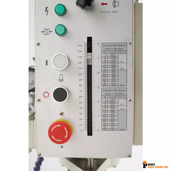 • Automatischer Pinolenvorschub: 3-stufig einstellbar (0,1 / 0,2 / 0,3 mm/U) für komfortables und gleichmäßiges Bohren.