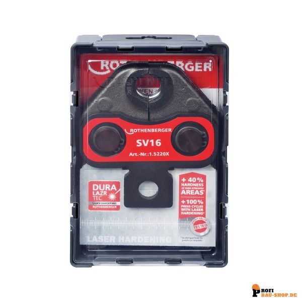 Die ROTHENBERGER Pressbacke Standard SV16 (16 mm) gewährleistet durch das DURA LAZR TEC Verfahren eine verlängerte Lebensdauer und höchste Präzision beim systemkonformen Verpressen von Fittings für Metallrohrsysteme.
