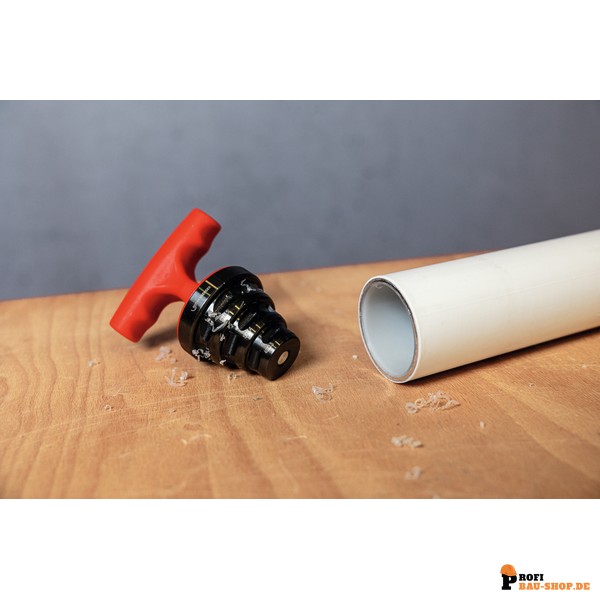 • Für das Kalibrieren und Entgraten der gängigsten Großdurchmesser von Kunststoffrohren (40x3,5 / 50x4 / 63x4,5 mm).