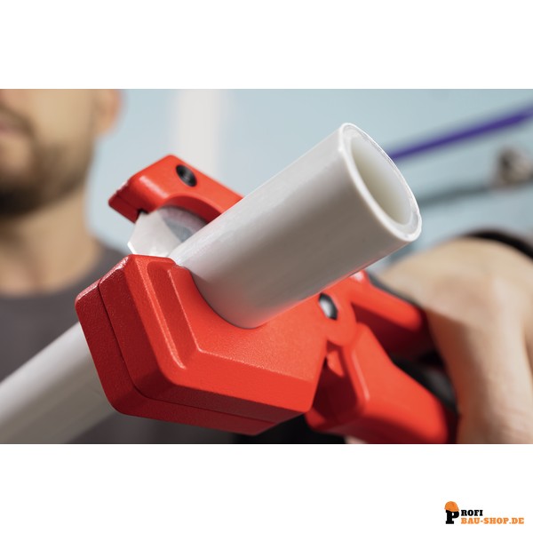 • Speziell für Mehrschichtverbundrohr mit Aluminiumkern geeignet, außerdem können alle gängigen Kunststoffrohre bis zu einem Durchmesser von 26mm geschnitten werden.
