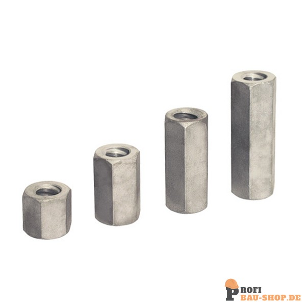 Robuste Schake Sechskantmuttern SW30 aus hochwertigem St52.3 Stahl, ideal für Rollgewindestäbe 15 mm. Mit einer Länge von 90 mm bieten sie sicheren Halt und Langlebigkeit für anspruchsvolle Bauprojekte und im Bereich der Verkehrssicherung.