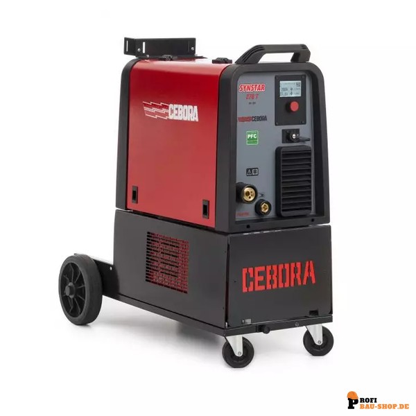 SYNSTAR 270 T, Art 324, Upgradefähig für PULS & DOPPELPULS, Kompaktgerät inkl. Transportwagen, Massekabel 35 qmm/3m mit Klemme, 4-Rollen-Drahtvorschub Rollen Ø30mm für 0,6/0,8 & 1,0/1,2 mm für Stahldraht !!! 20-270Ampere, ED 60% bei 220 Amp.