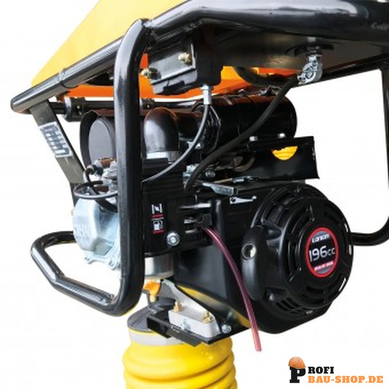 Angetrieben wird der Stampfer von einem leistungsstarken Loncin 4-Takt-Benzinmotor mit 4,1 kW (5,6 PS), der auch unter harten Bedingungen eine konstante Performance liefert. Die massive Stahlkonstruktion in Kombination mit einer robusten Kunststoffabdeckung schützt den Motor zuverlässig vor äußeren Einflüssen und mechanischen Beschädigungen. Dank der kompakten Bauweise und der optimierten Gewichtsverteilung von 77 kg lässt sich die Maschine präzise führen, was die Effizienz auf der Baustelle deutlich steigert.