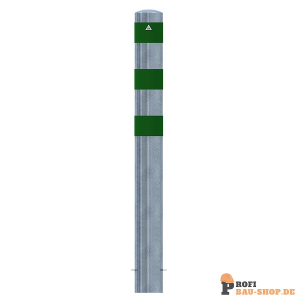 Technische Daten Rammschutzpoller als E-Ladesäulenschutz, Ø 152 mm, feuerverzinkt mit 3 grün reflektierenden Streifen Folie Typ RA1/A, zum Einbetonieren, Gesamthöhe 1200 mm
