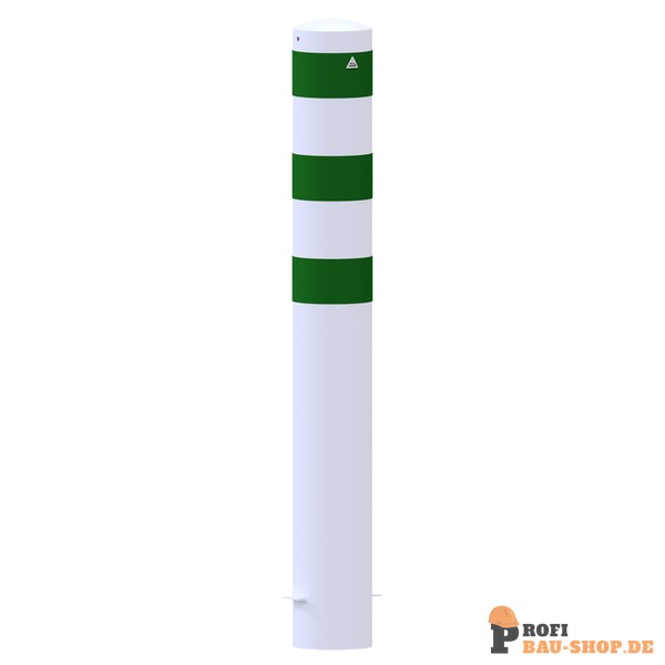 Schake Rammschutzpoller, E-Ladesäulenschutz, Ø 193 mm, feuerverzinkt, weiß pulverbeschichtet, 3 grüne RA1/A Reflexstreifen, zum Einbetonieren, H 1200 mm