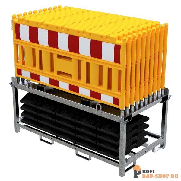 Absperrschrankengitter SET2 bestehend aus: 1 x Lager- und Transporttraverse für Absperrschrankengitter (Art.-Nr. 32000) 20 x Absperrschrankengitter 21 x TL-Fußplatte nach K1, 30 kg (Art.-Nr. 31991) 1 x Lager- und Transporttraverse für Fußplatten (Art.-Nr. 3B214)