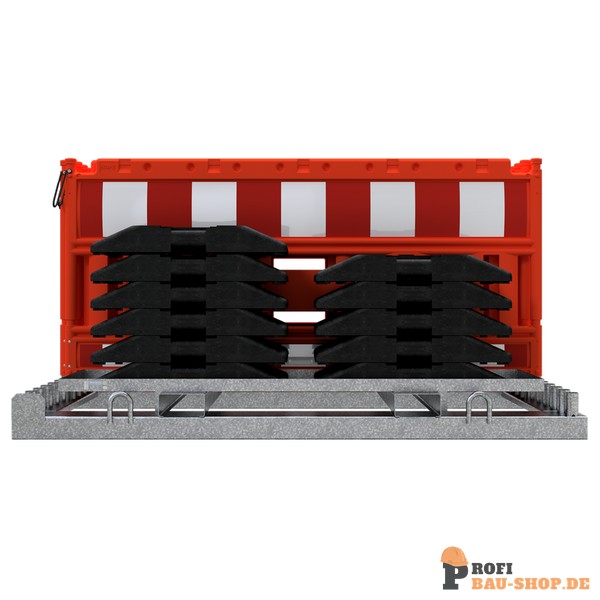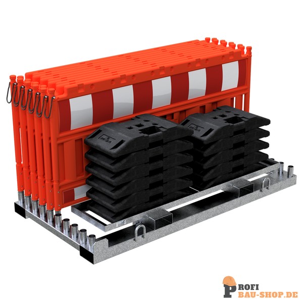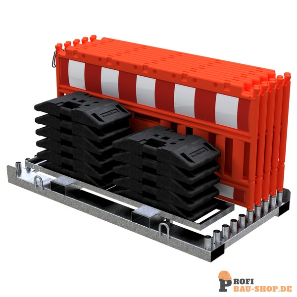 Absperrschrankengitter SET1 bestehend aus: 1 x Lager- und Transporttraverse für Absperrschrankengitter (Art.-Nr. 32000) 1 x Aufsatzteil für K1-Fußplatten (Art.-Nr. 32000-A) 10 x Absperrschrankengitter 11 x TL-Fußplatte nach K1, 30 kg (Art.-Nr. 31991) 2 x Zurrgurt 2-tlg. mit Ratsche (Art.-Nr. 50352-4)