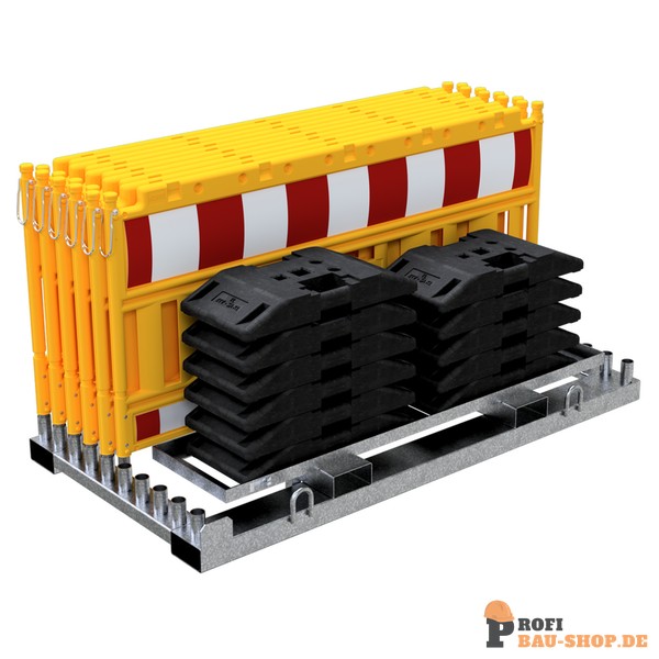 Absperrschrankengitter SET1 bestehend aus: 1 x Lager- und Transporttraverse für Absperrschrankengitter (Art.-Nr. 32000) 1 x Aufsatzteil für K1-Fußplatten (Art.-Nr. 32000-A) 10 x Absperrschrankengitter 11 x TL-Fußplatte nach K1, 30 kg (Art.-Nr. 31991) 2 x Zurrgurt 2-tlg. mit Ratsche (Art.-Nr. 50352-4)