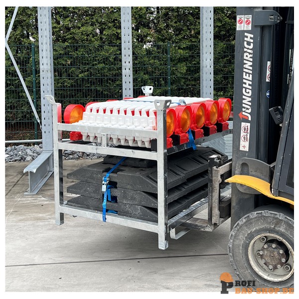 Schake SET 3 mit 10 Baken, Fußplatten und Lampen auf Lager- und Trasportpalette, mit Folie Typ RA1/A, rot/weiß, doppelseitig schraffiert, BASt Wendebake