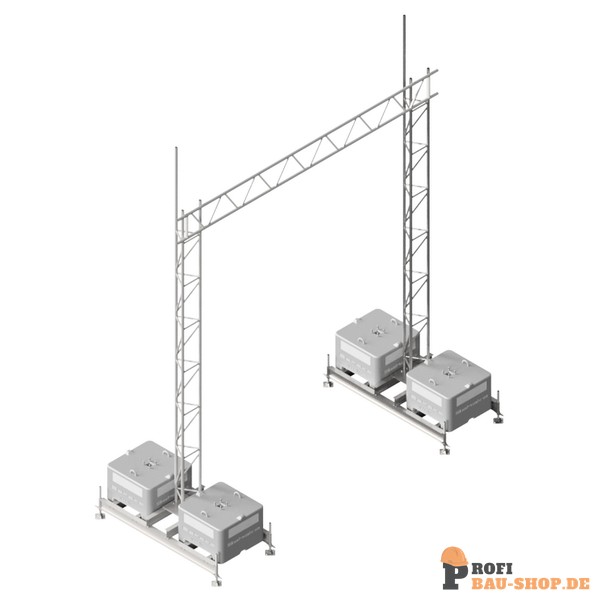 Aufstellvorrichtungen Brücke bestehend aus: 2 x Aufstellrahmen für Beton-Aufstellvorichtungen (Art.-Nr. 35350) 8 x Beton-Aufstellvorrichtung 1000 kg (Art.-Nr. 3F121) 2 x Gitterrohrmast 350, verzinkt, 6,15 m (Art.-Nr. 353017) 8 x Normalkupplung BB, feuerverzinkt (Art.-Nr. 3F120-5) 1 x Stahl-Gitterträger 450