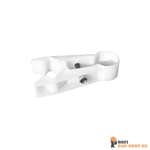Robuste Schake Verbindungsklemme zur sicheren Befestigung von Kunststoffbaken an Schrankenzäunen. Gefertigt aus schlagzähem Kunststoff und einfach verschraubbar.