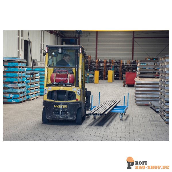 Der Bauer Südlohn Langgutseitenwagen LSW 2,5 in strahlendem Lichtblau (RAL 5012) ist die ideale Transportlösung für lange und sperrige Güter in Lager, Werkstatt und Produktion. Seine robuste Stahlkonstruktion garantiert Langlebigkeit und eine beeindruckende Tragfähigkeit von 2550 kg. Dank klappbarer Einfahrtaschen und seitlichem Einfahren der Gabelzinke ist er besonders flexibel und einfach zu handhaben, während die vier Lenkrollen eine hervorragende Manövrierbarkeit gewährleisten.
