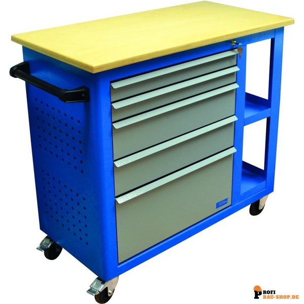 Dank der zwei Lenkrollen mit Feststeller und zwei Bockrollen ist der Werkstattwagen äußerst mobil und lässt sich mühelos an jeden Einsatzort bewegen. Ein seitliches Anbauteil mit höhenverstellbarem Fachboden erweitert die Ablagemöglichkeiten und sorgt für noch mehr Ordnung und Effizienz in Ihrer Werkstatt.