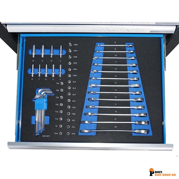Ausgestattet mit sieben leichtgängigen Schubladen, die über einen komfortablen 100% Vollauszug und kugelgelagerte Führungen verfügen, ermöglicht er einen schnellen und einfachen Zugriff auf jedes Werkzeug. Die integrierten Softeinlagen halten Ihr Werkzeug sicher an Ort und Stelle, während der ergonomische Schiebegriff und der robuste Kantenschutz das Manövrieren erleichtern. Große Ablageflächen oben und praktische Kleinteilefächer sorgen für zusätzliche Arbeitserleichterung und Übersichtlichkeit.