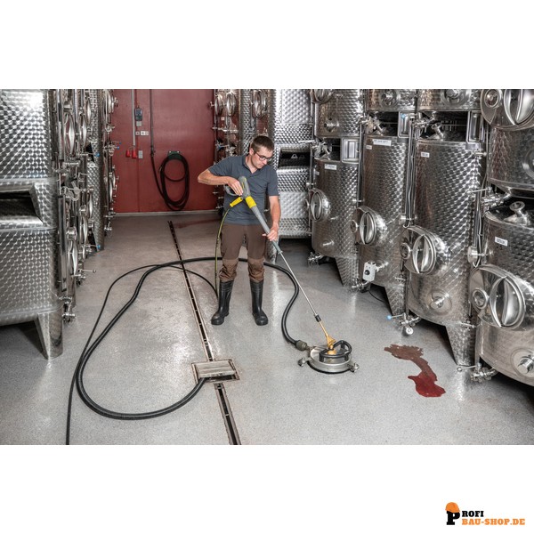 Der Kärcher Flächenreiniger FRV 50 Me setzt neue Maßstäbe in der professionellen Flächenreinigung, insbesondere für die Bearbeitung von besonders großen Arealen. Seine herausragende Eigenschaft ist die automatische Schmutzwasserabsaugung, die eine effiziente und hygienische Reinigung in einem Arbeitsgang ermöglicht. Er ist optimal für die Heißwasserreinigung bis zu 85 °C ausgelegt und bewältigt Drücke von bis zu 250 bar sowie eine Fördermenge von 2000 l/h. Das Gerät zeichnet sich durch einen temperaturbeständigen 10-m-Absaugschlauch aus Polyurethan, nicht zeichnende Lenkrollen und eine doppelte Keramiklagerung aus, was Langlebigkeit und zuverlässige Performance gewährleistet. Bitte beachten Sie, dass ein gerätespezifisches Düsenkit separat bestellt werden muss.
