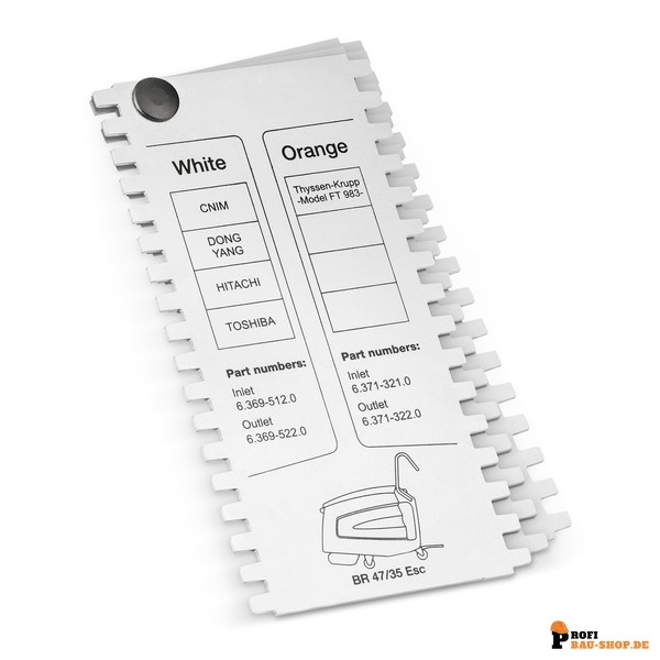 Die Kärcher Schablone Profil BR 47/35 ESC ist ein unverzichtbares Zubehör für den Rolltreppenreiniger BR 47/35 ESC und wurde speziell für die präzise Bestimmung der passenden Ein- und Auslaufkämme entwickelt. Diese innovative Schablone ermöglicht ein einfaches und schnelles Ablesen der Rolltreppenprofile, um die Kompatibilität mit den vielfältigen Modellen verschiedener Rolltreppenhersteller zu gewährleisten. Dadurch wird die Identifikation der benötigten Kämme erheblich vereinfacht und die Einsatzbereitschaft Ihres Kärcher Rolltreppenreinigers maximiert, was zu einer effizienten und universellen Reinigungslösung führt.