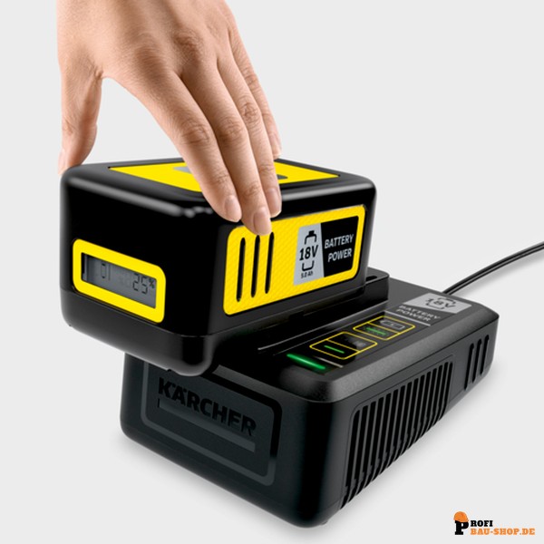 Das Kärcher Starter Kit Battery Power 18/50 beinhaltet einen 18 V / 5,0 Ah Wechselakku mit Real Time Technology und ein Schnellladegerät, ideal für alle Kärcher 18 V Akkuplattformgeräte.