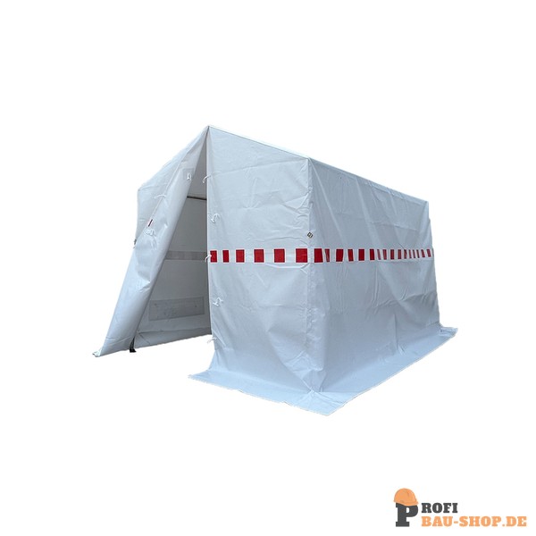 Arbeitszelt Zelt in wenigen Minuten auf- und abbaubar. Gewebe: beidseitig PVC-beschichtetes Gewebe, ca. 600 g/m², schwer entflammbar, Standardfarbe: weiß Gerüst: Stahlrohr Ø 32/1,5 mm, zusammenlegbar Maße: Länge x Breite Mittelhöhe: 2100 mm Seitenhöhe: 1650 mm