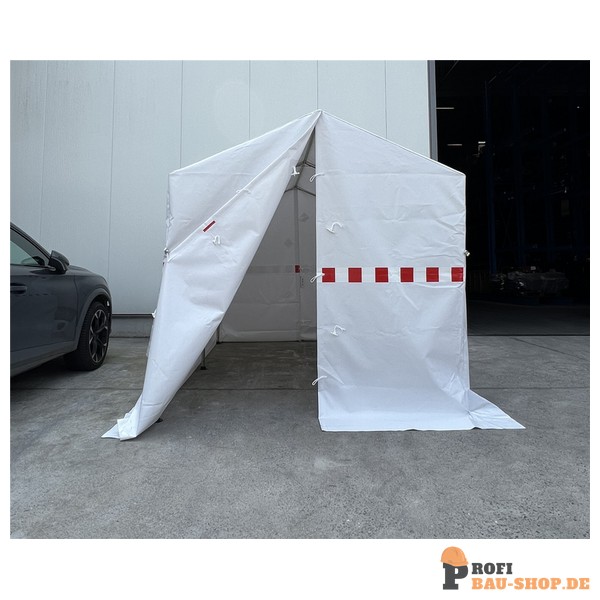 Arbeitszelt Zelt in wenigen Minuten auf- und abbaubar. Gewebe: beidseitig PVC-beschichtetes Gewebe, ca. 600 g/m², schwer entflammbar, Standardfarbe: weiß Gerüst: Stahlrohr Ø 32/1,5 mm, zusammenlegbar Maße: Länge x Breite Mittelhöhe: 2100 mm Seitenhöhe: 1650 mm